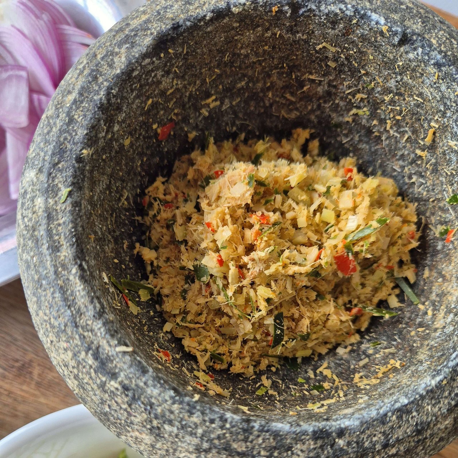 The Paste – Since we’re using a mortar and pestle for this, go ahead and slice all your paste ingredients nice and thin. Trust me, your arms will thank you later! It does take a little time, so settle in and pound with a steady rhythm until everything becomes a dry, powdery paste. It’s kind of meditative once you get going. Short on time? No worries, you can pop everything into a chopper. Just try to avoid adding water so the texture stays close to the original.